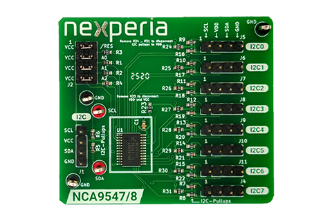 The NEVB-NCA9548A_NCA9547 evaluation board is a compact platform for evaluating Nexperia’s 8-channel I2C switch and multiplexer devices. It supports the NCA9548A with multiple active channels and the NCA9547 with one active channel at a time and RESET capability. The board provides easy access to upstream and downstream I2C buses, jumper-selectable address and reset control, dedicated test points, and support for Fast-mode I2C up to 400 kHz.